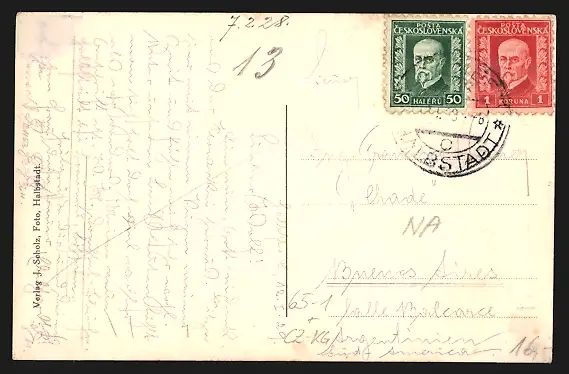 Personenbezogene Daten auf der Rückseite der Karte wurden durch blauen Textmarker unkenntlich gemacht. Die blauen Stellen sind auf die Vorderseite durchgeweicht und wirken sich negativ auf das Postkartenfoto aus