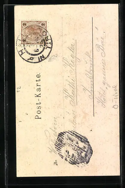 Personenbezogene Daten auf der Rückseite der Karte wurden durch blauen Textmarker unkenntlich gemacht. Die blauen Stellen sind auf die Vorderseite durchgeweicht und wirken sich negativ auf das Postkartenfoto aus