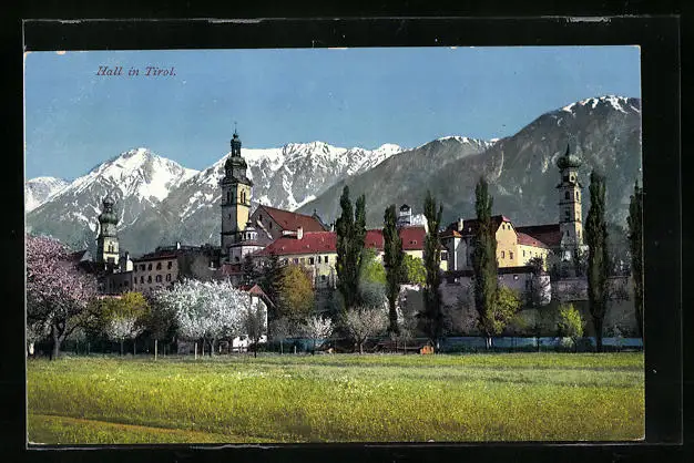 AK Hall, Ortspartie an den Feldern mit Rathaus