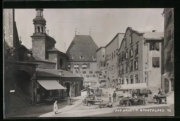 AK Hall, Stadtplatz mit Marktständen und Brunnen