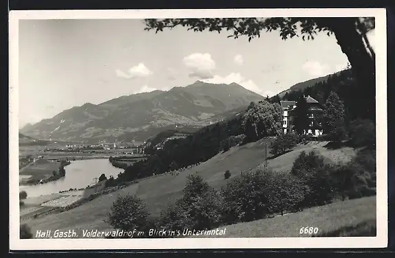AK Hall /Tirol, Der Gasthof Volderwaldhof mit Blick ins Unterinntal