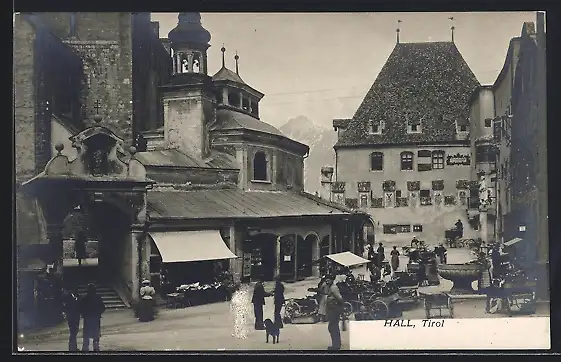 AK Hall /Tirol, Strassenpartie mit Brunnen