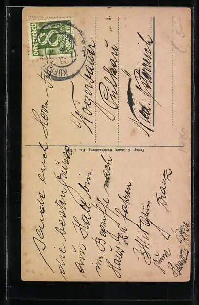 Personenbezogene Daten auf der Rückseite der Karte wurden durch blauen Textmarker unkenntlich gemacht. Die blauen Stellen sind auf die Vorderseite durchgeweicht und wirken sich negativ auf das Postkartenfoto aus
