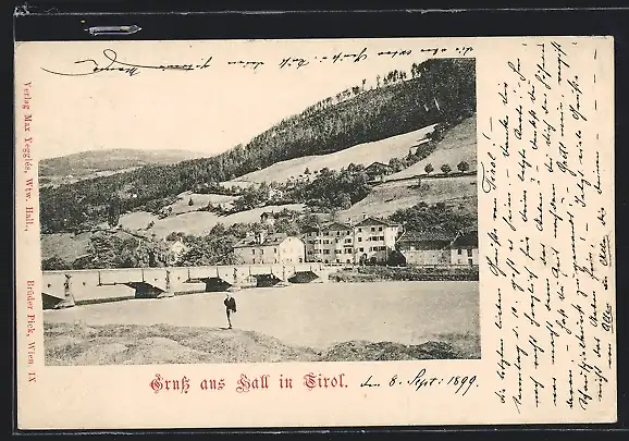 AK Hall in Tirol, Ortsansicht mit Flussbrücke
