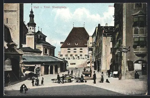 AK Hall in Tirol, Stadtplatz mit Passanten