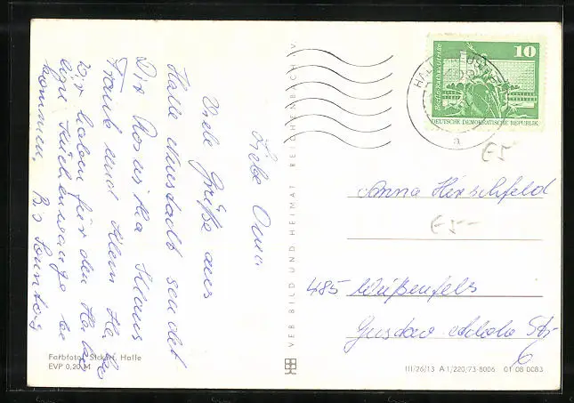Personenbezogene Daten auf der Rückseite der Karte wurden durch blauen Textmarker unkenntlich gemacht. Die blauen Stellen sind auf die Vorderseite durchgeweicht und wirken sich negativ auf das Postkartenfoto aus