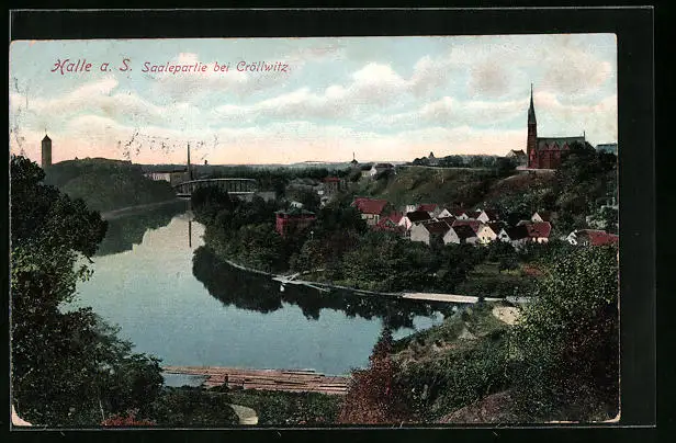 AK Halle /Saale, Flusspartie und Kirche im Hintergrund