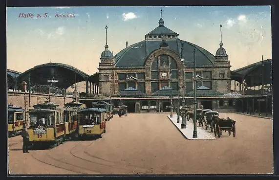 AK Halle / Saale, Partie am Bahnhof mit Strassenbahn