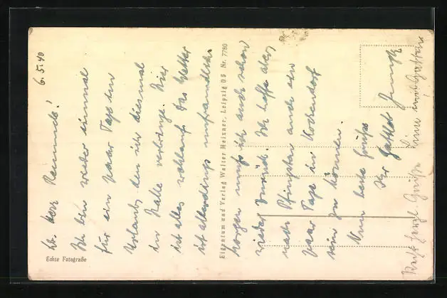 Personenbezogene Daten auf der Rückseite der Karte wurden durch blauen Textmarker unkenntlich gemacht. Die blauen Stellen sind auf die Vorderseite durchgeweicht und wirken sich negativ auf das Postkartenfoto aus