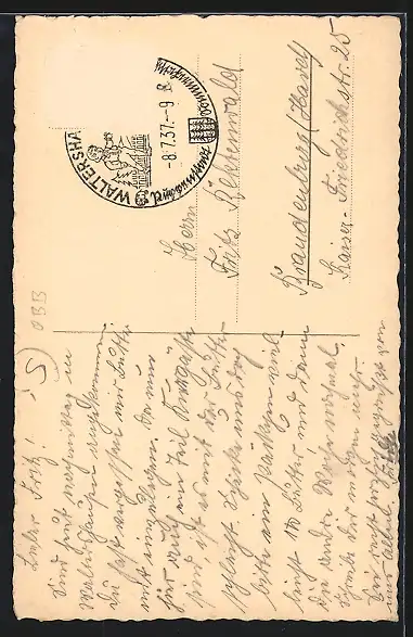 gelaufen 1937, Briefmarke entfernt, rückseitig Oberflächenschaden, Eckknick re. oben, Bugspur oben mittig, guter Zustand
