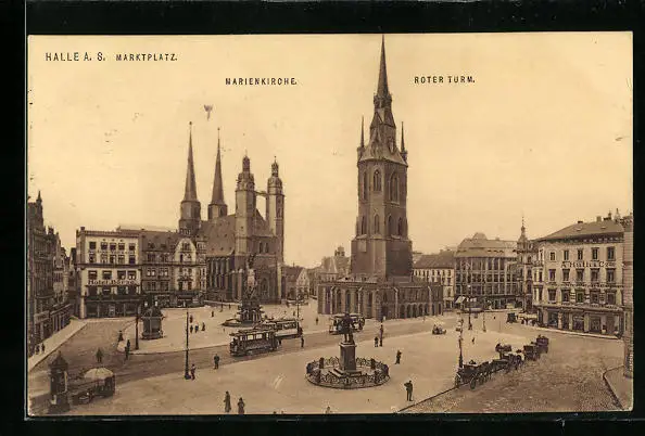 AK Halle a. S., Marktplatz mit Marienkirche, Rotem Turm und Strassenbahn