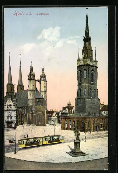 AK Halle a. S., Marktplatz mit Strassenbahn