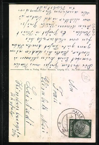 Personenbezogene Daten auf der Rückseite der Karte wurden durch blauen Textmarker unkenntlich gemacht. Die blauen Stellen sind auf die Vorderseite durchgeweicht und wirken sich negativ auf das Postkartenfoto aus