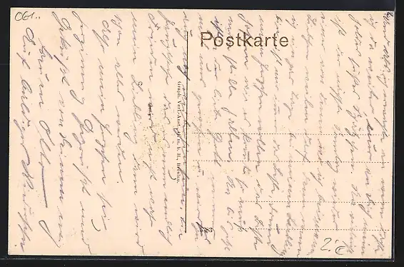 Personenbezogene Daten auf der Rückseite der Karte wurden durch blauen Textmarker unkenntlich gemacht. Die blauen Stellen sind auf die Vorderseite durchgeweicht und wirken sich negativ auf das Postkartenfoto aus