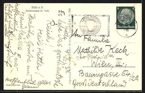 AK Halle a. S., Rathauseingang bei Nacht
