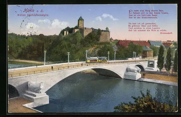 AK Halle a. S., Ruine Giebichenstein mit Saalebrücke und Strassenbahn
