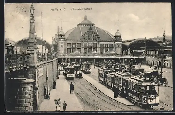 AK Halle a. S., Strassenbahnen am Hauptbahnhof