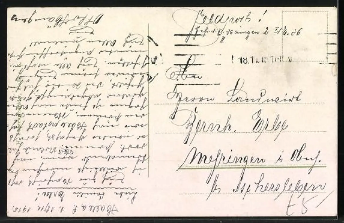 Personenbezogene Daten auf der Rückseite der Karte wurden durch blauen Textmarker unkenntlich gemacht. Die blauen Stellen sind auf die Vorderseite durchgeweicht und wirken sich negativ auf das Postkartenfoto aus