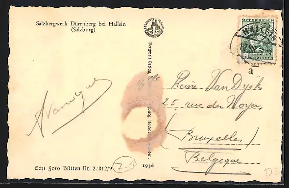 Personenbezogene Daten auf der Rückseite der Karte wurden durch blauen Textmarker unkenntlich gemacht. Die blauen Stellen sind auf die Vorderseite durchgeweicht und wirken sich negativ auf das Postkartenfoto aus