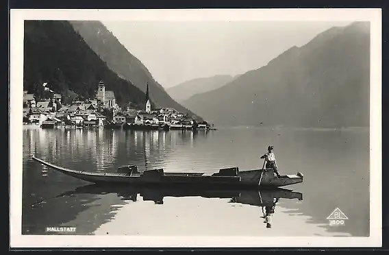 AK Hallstatt, Fischerboot auf dem See, Blick zum Ort