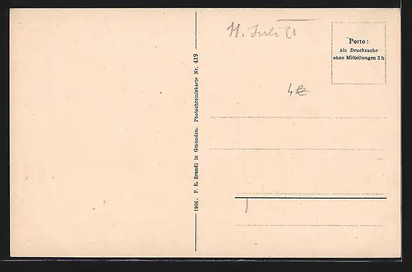 Personenbezogene Daten auf der Rückseite der Karte wurden durch blauen Textmarker unkenntlich gemacht. Die blauen Stellen sind auf die Vorderseite durchgeweicht und wirken sich negativ auf das Postkartenfoto aus