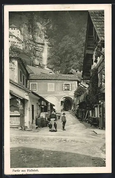 AK Hallstatt, Ortspartie mit Anwohnern am Berg