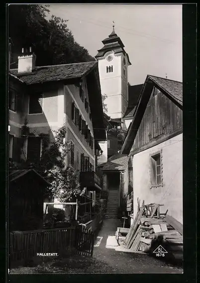 AK Hallstatt, Strassenpartie mit Treppenaufgang zur Kirche
