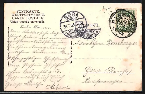 Personenbezogene Daten auf der Rückseite der Karte wurden durch blauen Textmarker unkenntlich gemacht. Die blauen Stellen sind auf die Vorderseite durchgeweicht und wirken sich negativ auf das Postkartenfoto aus