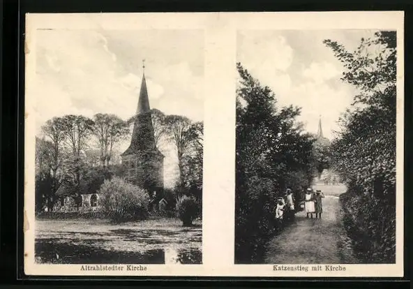 AK Hamburg-Altrahlstedt, Kirche und Katzenstieg mit Passanten