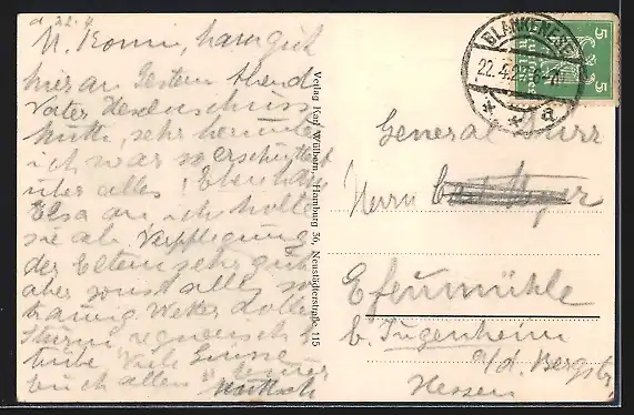 Personenbezogene Daten auf der Rückseite der Karte wurden durch blauen Textmarker unkenntlich gemacht. Die blauen Stellen sind auf die Vorderseite durchgeweicht und wirken sich negativ auf das Postkartenfoto aus