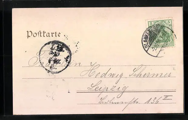 Personenbezogene Daten auf der Rückseite der Karte wurden durch blauen Textmarker unkenntlich gemacht. Die blauen Stellen sind auf die Vorderseite durchgeweicht und wirken sich negativ auf das Postkartenfoto aus