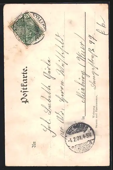 gelaufen 1901, Eckknicke re. oben u. li., Bugspur li. unten, guter Zustand