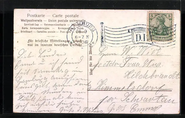 alte Ansichtskarte, gelaufen 1906, Stempelspur, minimaler Einriss re. oben, guter Zustand