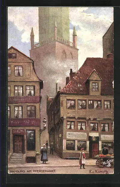 AK Hamburg, Häuser am Pferdemarkt, Jakobikirche im Hintergrund