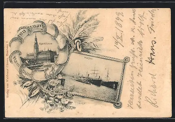 AK Hamburg, Hafen, Rathaus in einem Rettingsring