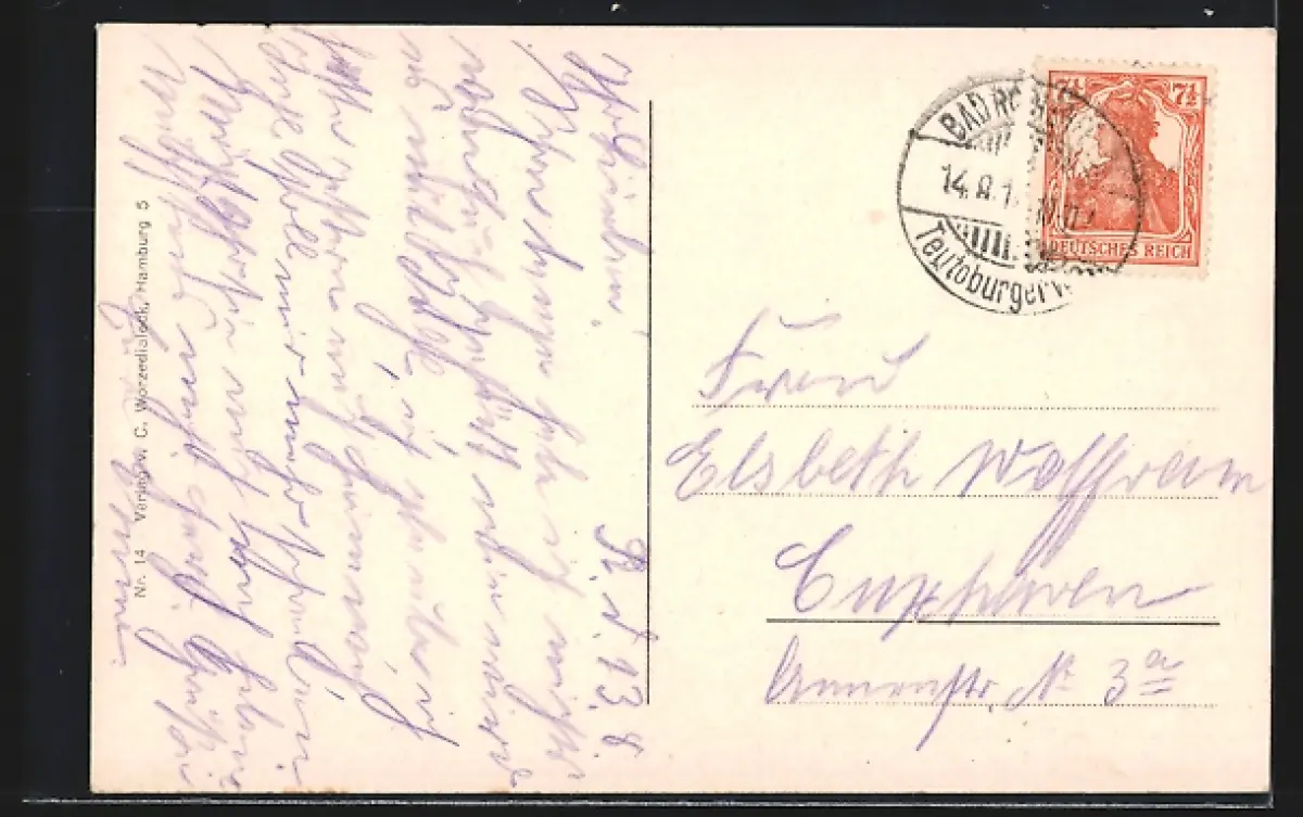 Personenbezogene Daten auf der Rückseite der Karte wurden durch blauen Textmarker unkenntlich gemacht. Die blauen Stellen sind auf die Vorderseite durchgeweicht und wirken sich negativ auf das Postkartenfoto aus