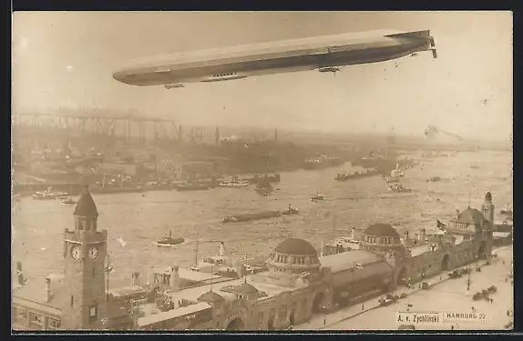 AK Hamburg, Luftschiff Zeppelin über dem Hafen