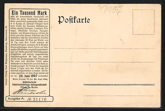 Personenbezogene Daten auf der Rückseite der Karte wurden durch blauen Textmarker unkenntlich gemacht. Die blauen Stellen sind auf die Vorderseite durchgeweicht und wirken sich negativ auf das Postkartenfoto aus