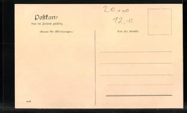 Personenbezogene Daten auf der Rückseite der Karte wurden durch blauen Textmarker unkenntlich gemacht. Die blauen Stellen sind auf die Vorderseite durchgeweicht und wirken sich negativ auf das Postkartenfoto aus
