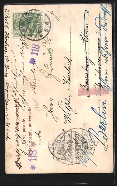 Personenbezogene Daten auf der Rückseite der Karte wurden durch blauen Textmarker unkenntlich gemacht. Die blauen Stellen sind auf die Vorderseite durchgeweicht und wirken sich negativ auf das Postkartenfoto aus