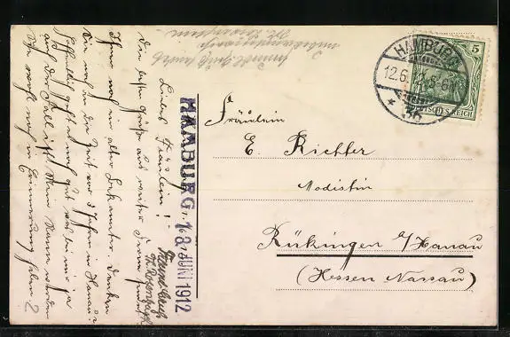 gelaufen 1912, Eckknick oben links, guter Zustand