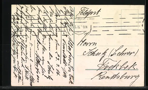 Personenbezogene Daten auf der Rückseite der Karte wurden durch blauen Textmarker unkenntlich gemacht. Die blauen Stellen sind auf die Vorderseite durchgeweicht und wirken sich negativ auf das Postkartenfoto aus
