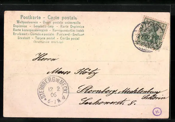 alte Ansichtskarte, gelaufen 1906, leichte Bugspur rechts oben, guter Zustand