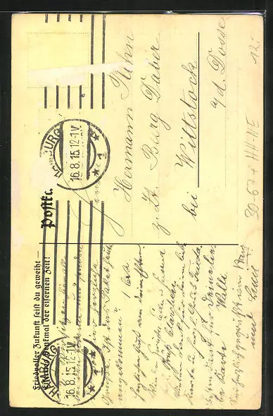 gelaufen 1915, Briefmarke entfernt, rückseitig Klebe- und Papierreste, rückseitig Oberflächenschaden, Stempelspur, guter Zustand