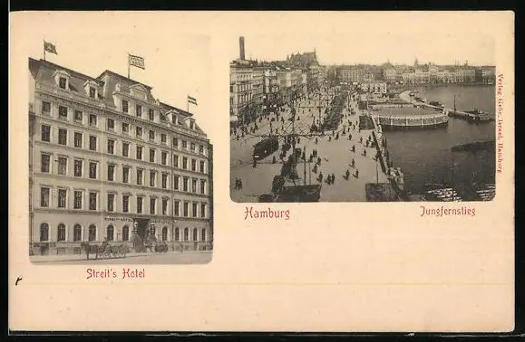 AK Hamburg-Neustadt, Streit`s Hotel, Jungfernstieg mit Strassenbahn