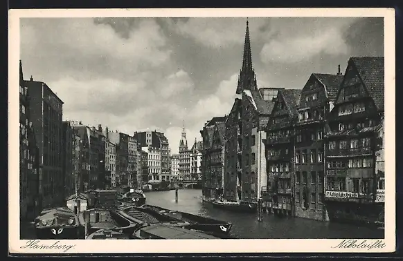 AK Hamburg, Nikolaiflet, Speicherstadt mit Booten