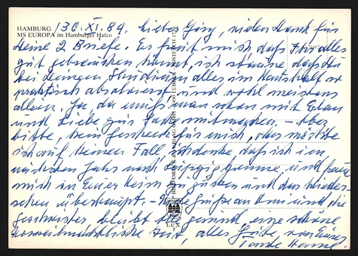 Personenbezogene Daten auf der Rückseite der Karte wurden durch blauen Textmarker unkenntlich gemacht. Die blauen Stellen sind auf die Vorderseite durchgeweicht und wirken sich negativ auf das Postkartenfoto aus