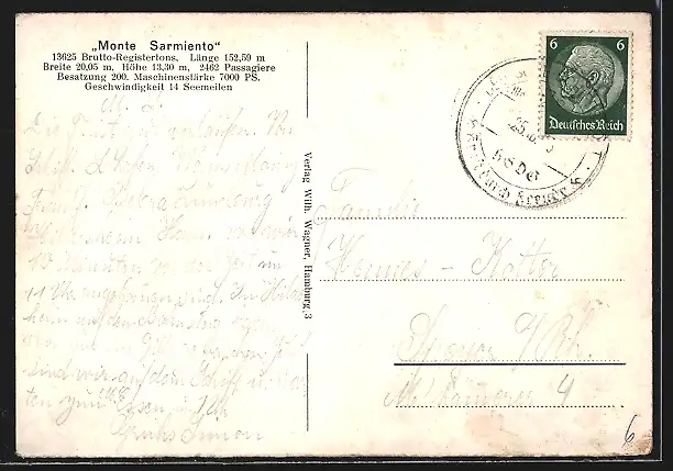AK Hamburg, Passagierschiff Monte Sarmiento im Hafen