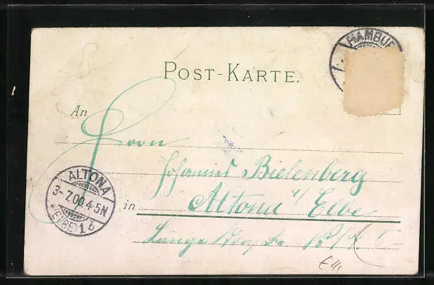 alte Ansichtskarte, gelaufen 1900, Briefmarke entfernt, rückseitig Oberflächenschaden, Stempelspur, guter Zustand