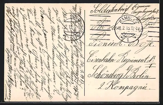 Personenbezogene Daten auf der Rückseite der Karte wurden durch blauen Textmarker unkenntlich gemacht. Die blauen Stellen sind auf die Vorderseite durchgeweicht und wirken sich negativ auf das Postkartenfoto aus